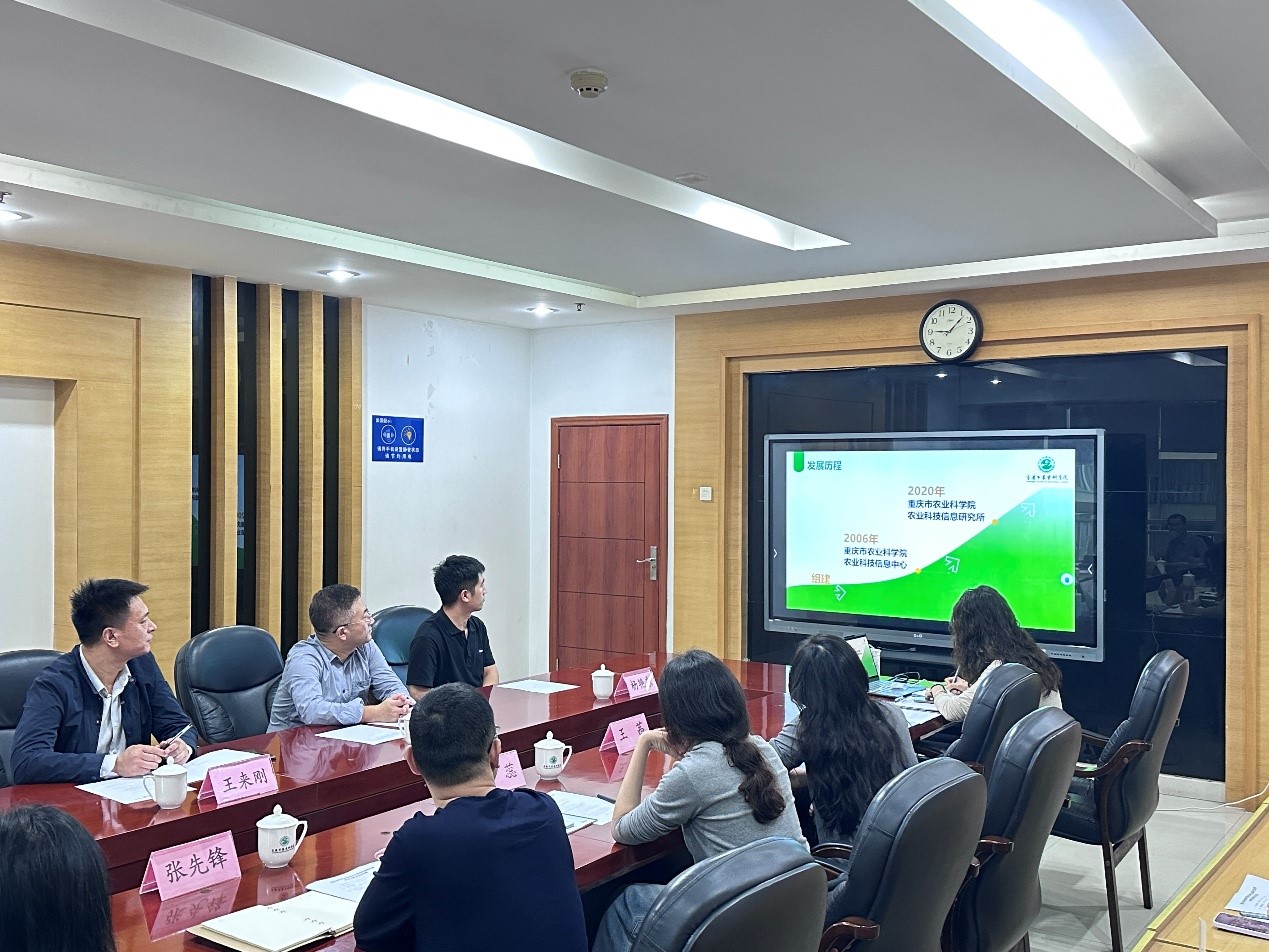 在交流会上,重庆市农科院信息所周蕊所长介绍了其所基本情况、团队建设和科研业绩等情况,同时双方重点围绕智慧农业、农业遥感、智能农机装备等科研工作方面进行了深入交流与讨论。随后一起参观调研了国家数字农业区域(西南)创新分中心建设情况。