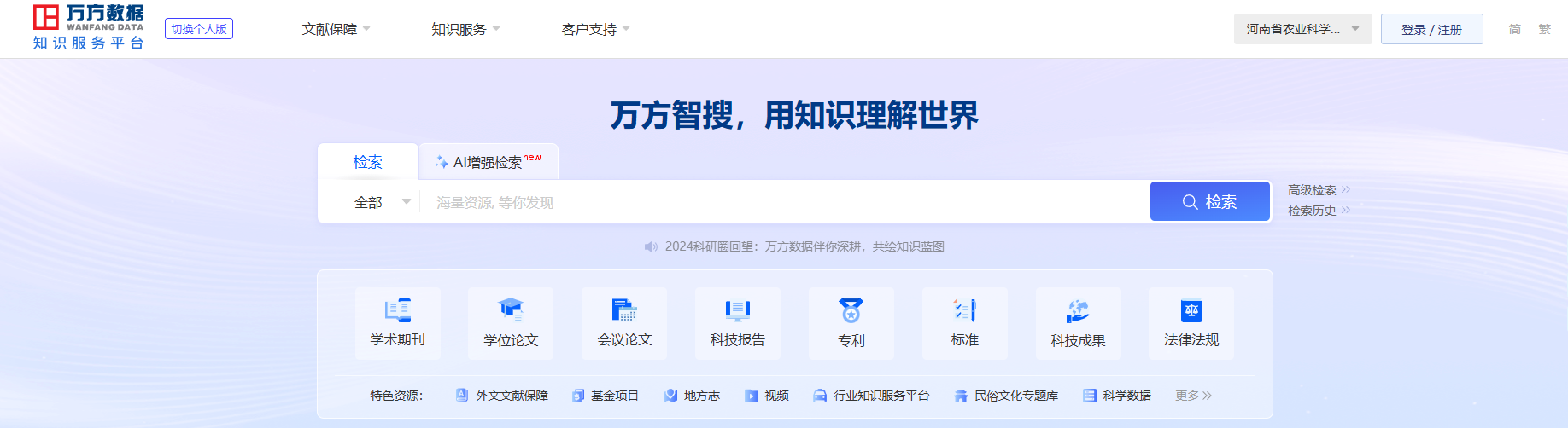 万方数据知识服务平台,官网:www.wanfangdata.com.cn。万方数据是中国最早的学术文献综合性数据库之一,集成了大量的学术期刊、学位论文、会议论文、科技报告等资源。该平台提供了强大的文献检索功能和全文下载服务,覆盖了广泛的学科领域。万方数据还提供了一系列的学术分析工具和数据挖掘功能,帮助用户进行学术研究和科学决策。万方数据也提供文献下载、期刊查询、论文查重等业务,还提供论文拟题等特色服务。